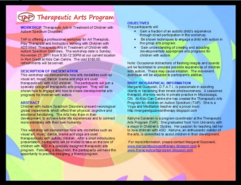 Therapeutic Arts Program (TAP) for Children and Youth with Special Needs and Autism, (now on-line therapy) is an exceptional forum to develop, learn social skills and connect with the arts. We help our clients grow and thrive, process and express their feelings and build friendships. TAP is conveniently located at Port Credit, Mississauga. For more information about the classes and programs please call Margaret Guzowski, Registered Psychotherapist/Art Therapist and owner, tel: 289-952-2640.